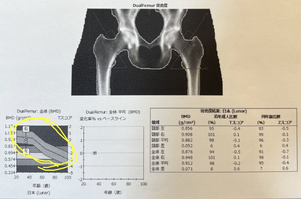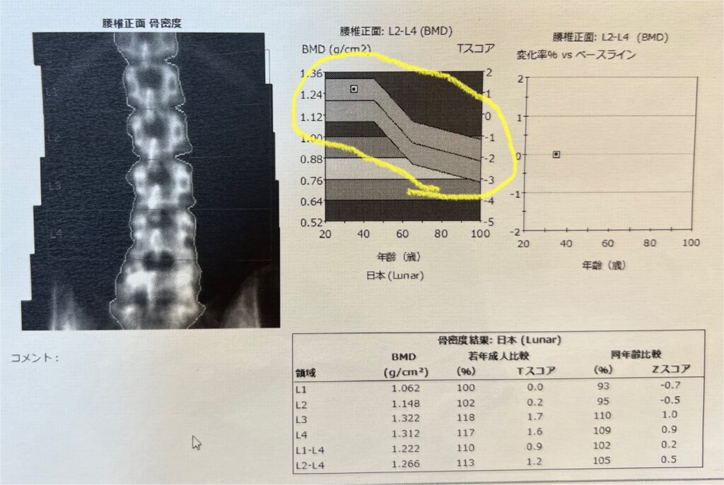 ↑2024年の骨密度 黄色いところが平均値 平均値よりもちょい上